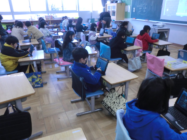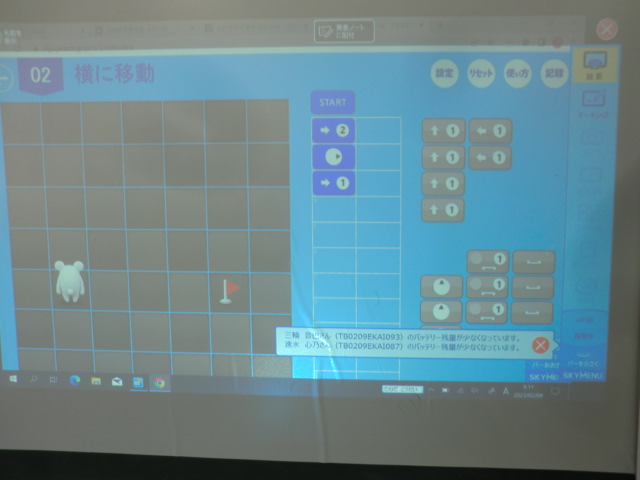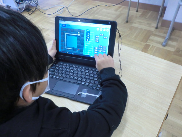 1年生がタブレットを使い、プログラミングの初歩としての学習に取り組みました。