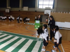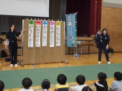 歩行の仕方や正しい自転車の乗り方について、四日市市交通安全教育指導員の「とみまつ隊」を招き、交通事故防止の学習を行いました。
