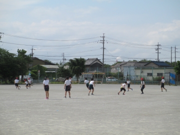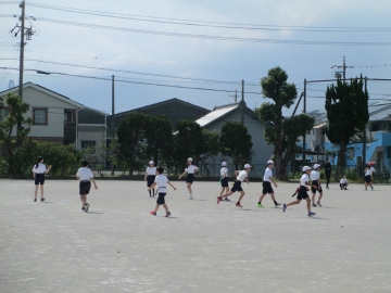 体育の時間に、腰にまいたタグ(しっぽ)を取り合う、走の運動「しっぽとり鬼ごっこ」をしました。