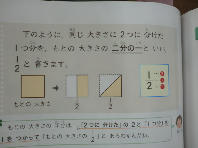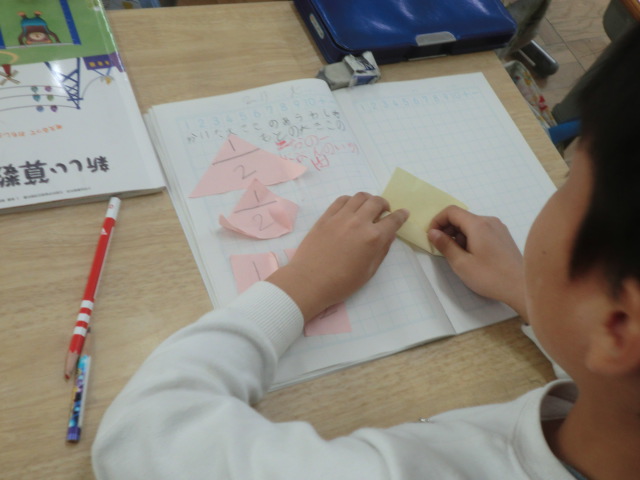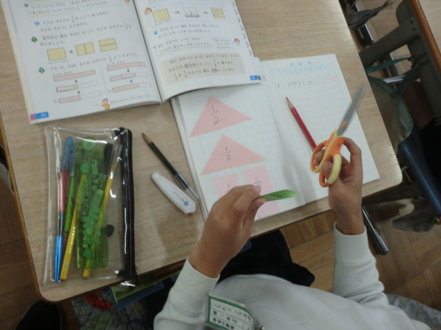 折り紙を切りながら、目と手で分数を実感していく2年生です。