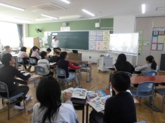 この単元では、世界の国名を英語で話せるとともに世界の国々でできることや食べられるもの、見ることができるものなどを友だちに伝えることを最終目標としています。