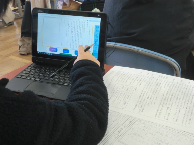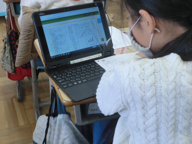 タブレットと用紙を使い、解答を作成していきます。今の時代の学び方に応じて5年生が集中して取り組みました。結果から、学びの課題や成果を今後に活かせるよう分析していきます。真剣な表情で頑張る5年生です。