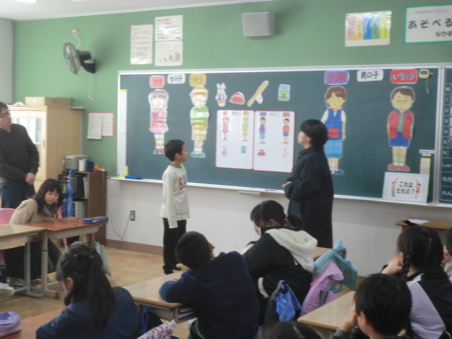 黒板に4人の子どもたちのイラストが掲示されました。服の色や髪形、服装は様々。