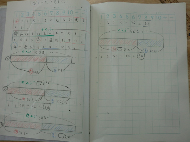 今後学習が発展していくと、自分で文章題から線分図を描いて考えることを学びます。その基礎を身に着けている2年生です。
