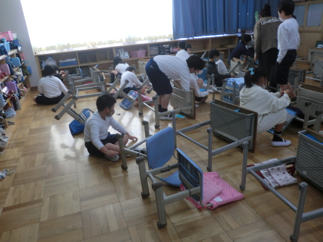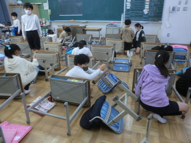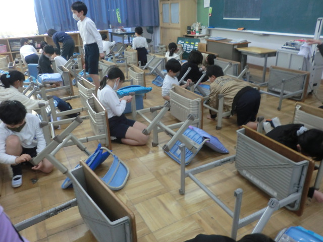 元気な声が聞こえてきました。4年生が、自分の椅子の足裏の溝にはまり込んでいたゴミを、掻き出してました。