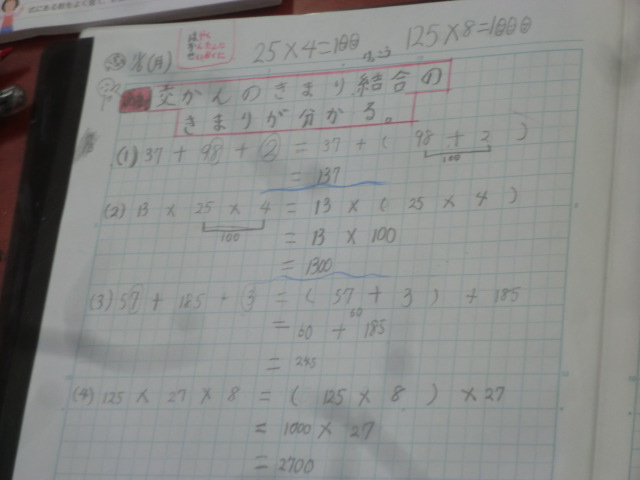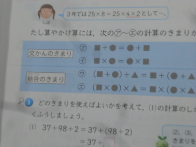 教科書には、足し算や掛け算の「交換の決まり」「結合の決まり」が整理されています。前時には「分配の決まり」も学びました。問題に応じてそれぞれの決まりをうまく使えるように思考する4年生です。