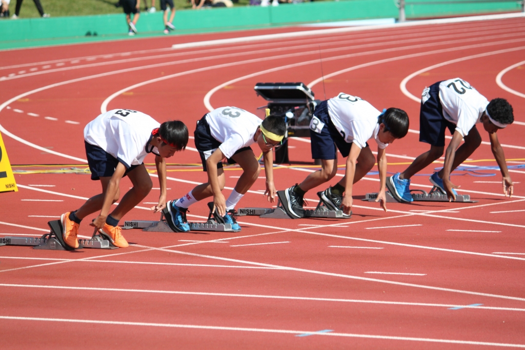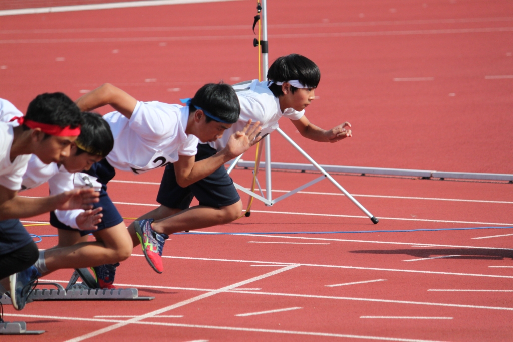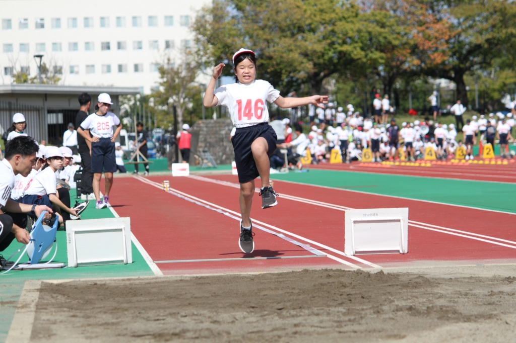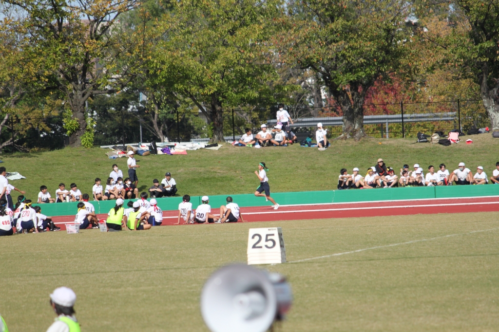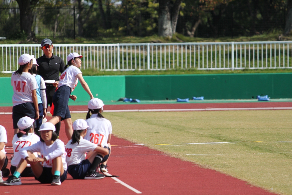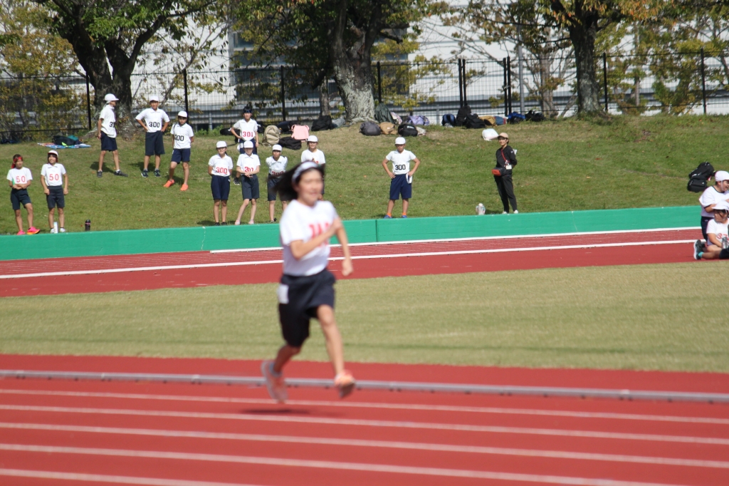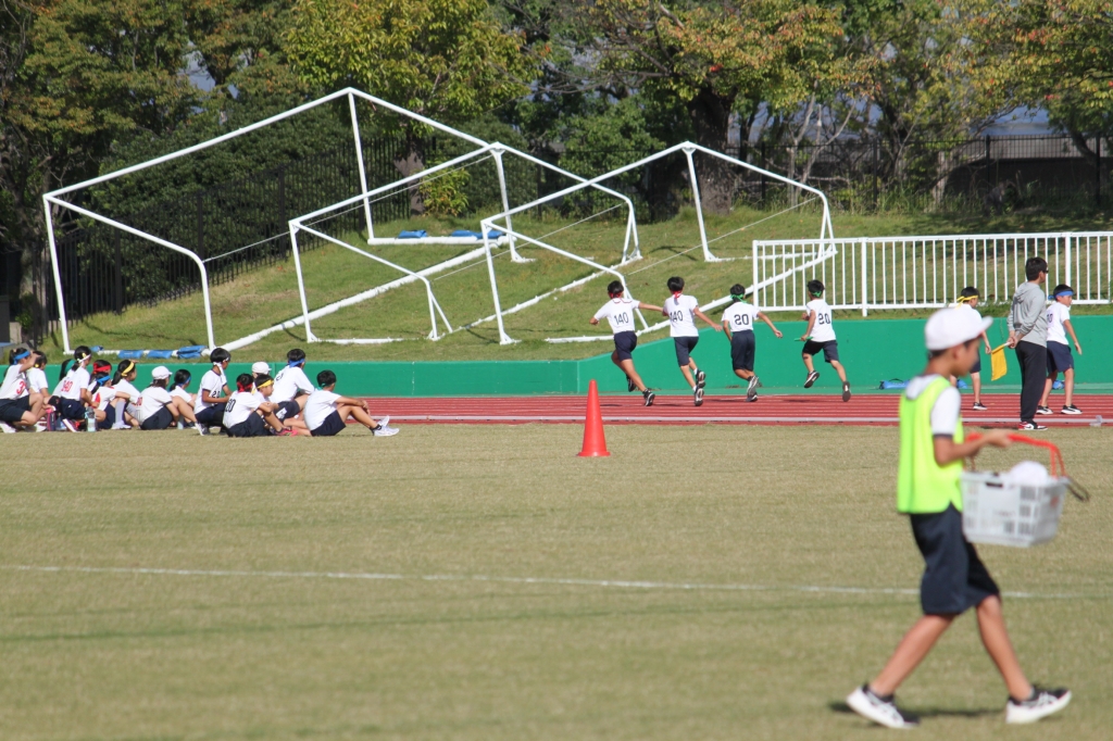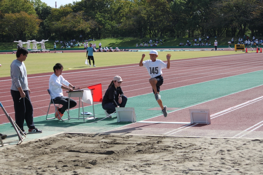 秋晴れの下、中央緑地公園で、第54回三泗小学校陸上記録会が開催されました。海蔵小学校からは、6年生から代表23名が「100m走」「ソフトボール投げ」「走り幅跳び」「400mリレー」の種目に参加。各校代表と、陸上競技を競い合いました。国体に備えて整備された競技場は、踏みしめると適度な反発が感じられるトラックです。土の運動場に比べると、足裏にしっかりとしたグリップを感じることができ、加速するときの滑りも抑制されます。陸上専用競技場で全力で走ることは、案外少ないので、貴重な体験になると思います。