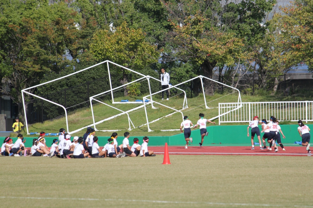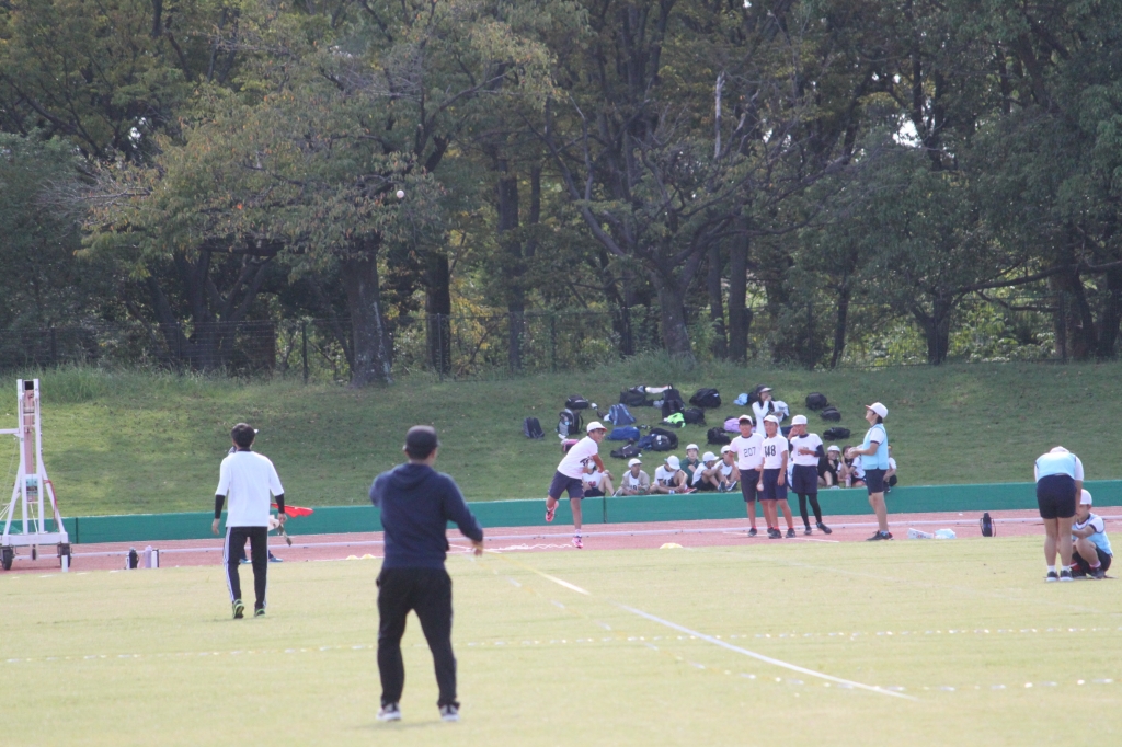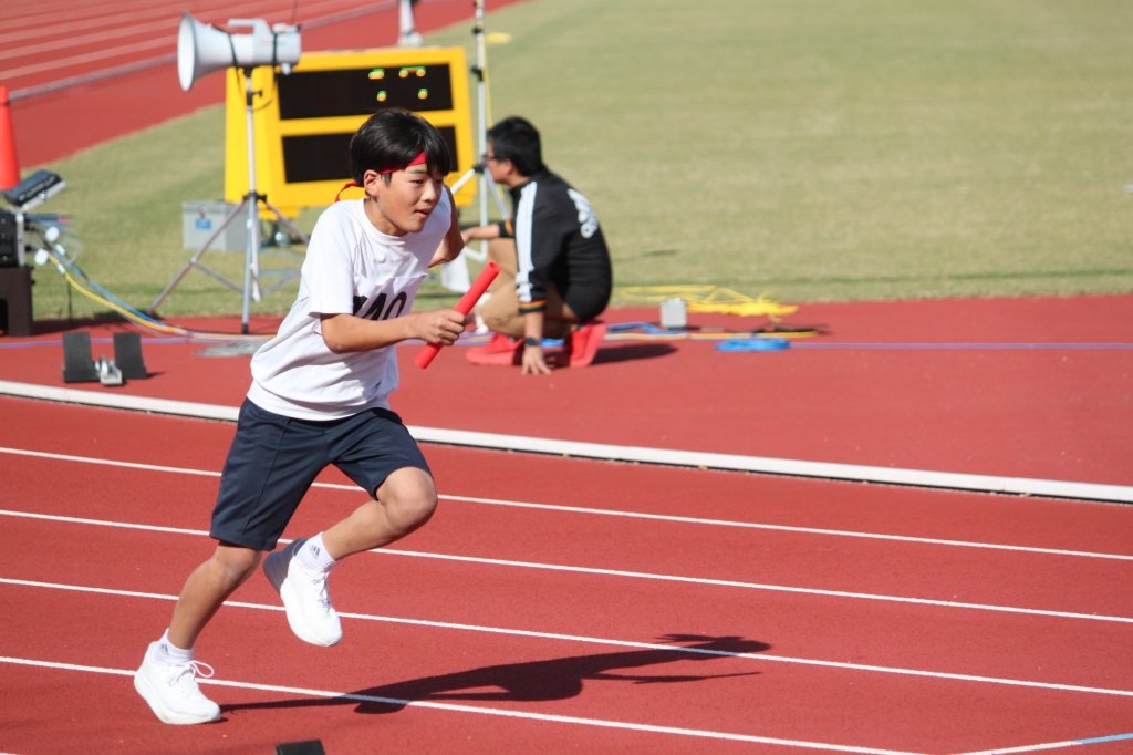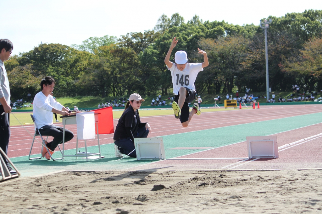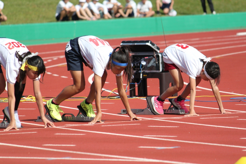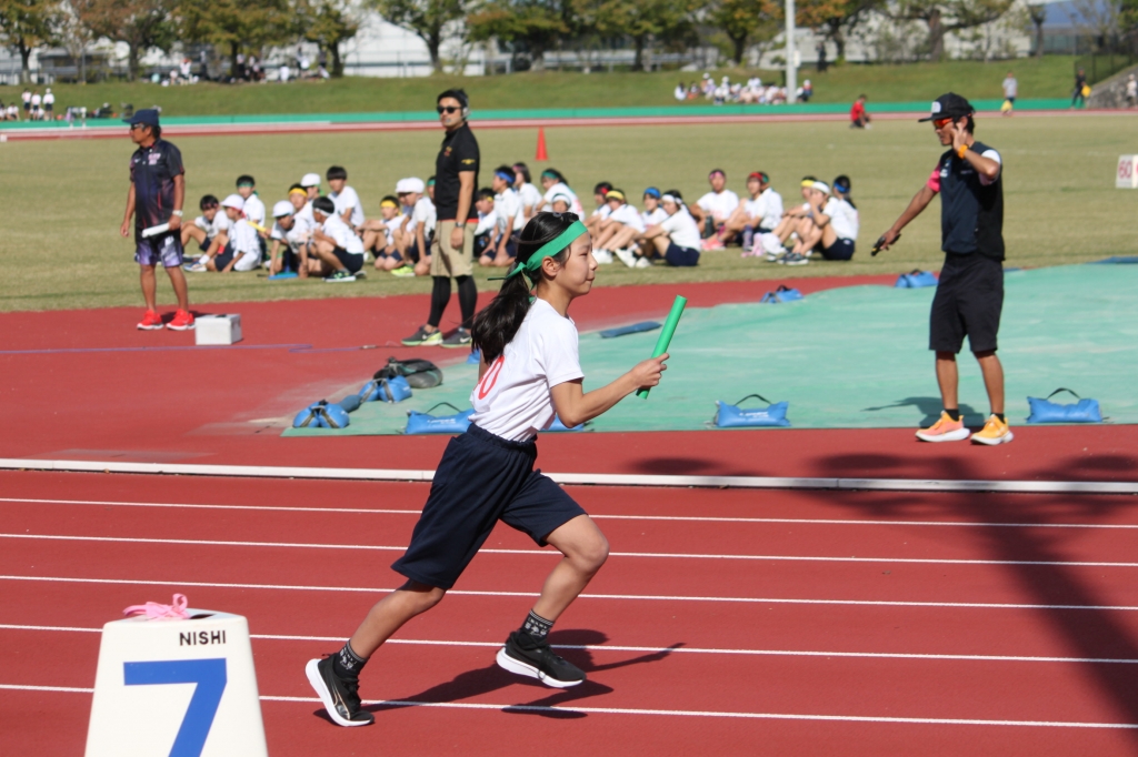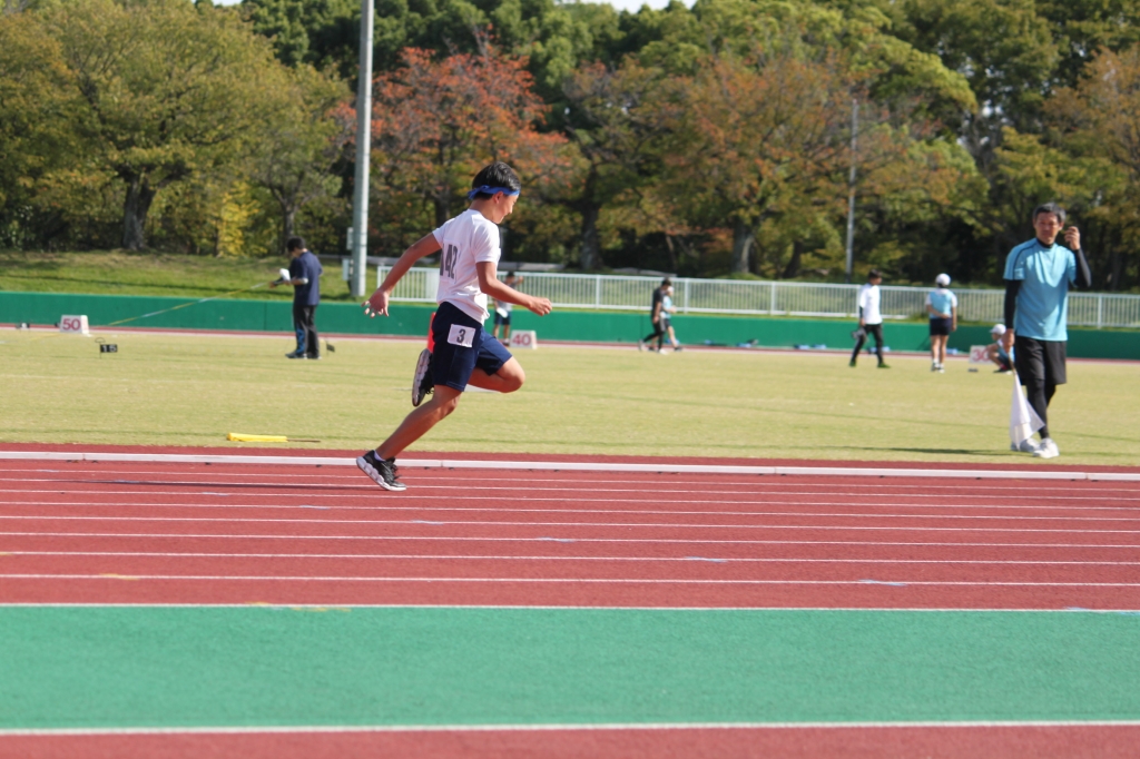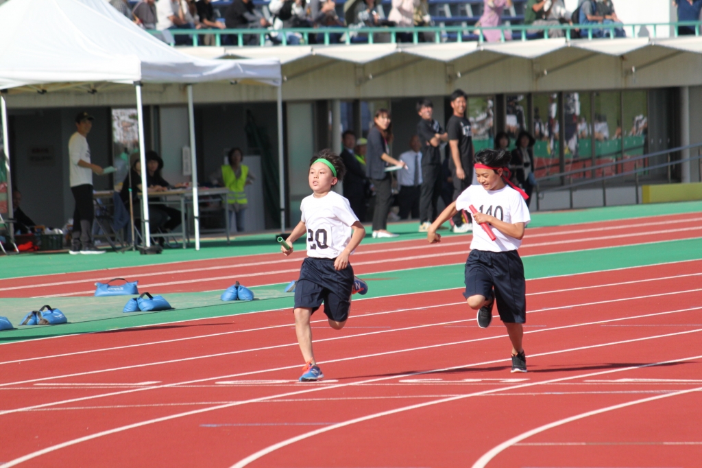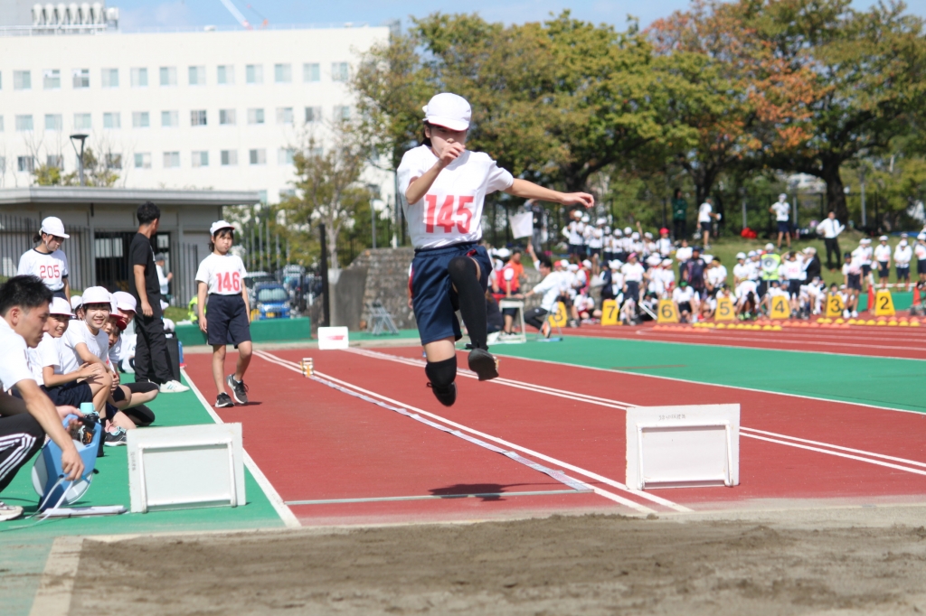 秋晴れの下、中央緑地公園で、第54回三泗小学校陸上記録会が開催されました。海蔵小学校からは、6年生から代表23名が「100m走」「ソフトボール投げ」「走り幅跳び」「400mリレー」の種目に参加。各校代表と、陸上競技を競い合いました。国体に備えて整備された競技場は、踏みしめると適度な反発が感じられるトラックです。土の運動場に比べると、足裏にしっかりとしたグリップを感じることができ、加速するときの滑りも抑制されます。陸上専用競技場で全力で走ることは、案外少ないので、貴重な体験になると思います。