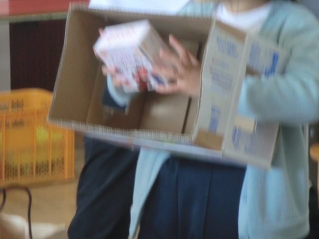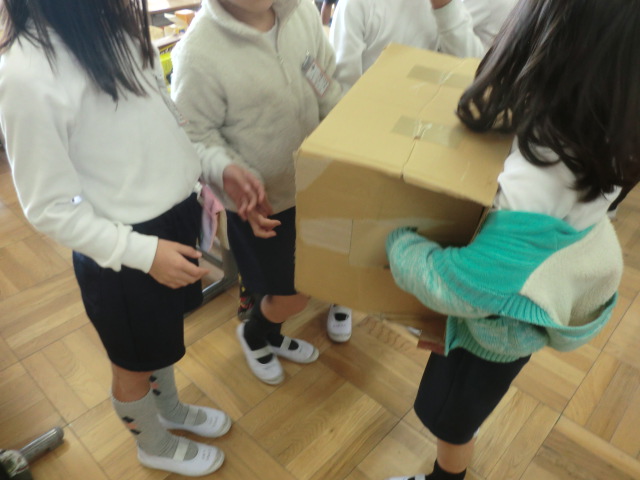 さらに、段ボール箱を半分にくりぬき、大きく二つ穴があけてあるものが配られました。いわゆるブラックボックスです。手触りでどんな形か特徴をとらえて話すことが課題です。