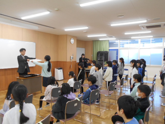 三泗小中書写展、美術展に学校代表として出品した児童の表彰式を行いました。
