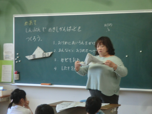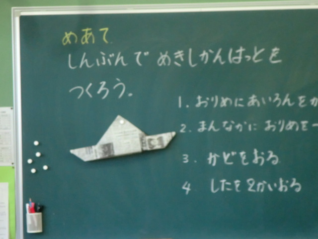 1年生が図工の時間に、新聞紙を使い工作していました。黒板には「しんぶんしで めきしかん はっと をつくろう」。指導者に、折り方手順を説明をしてもらい、巨大な折り紙に挑戦。「1 おりめに あいろんを…」