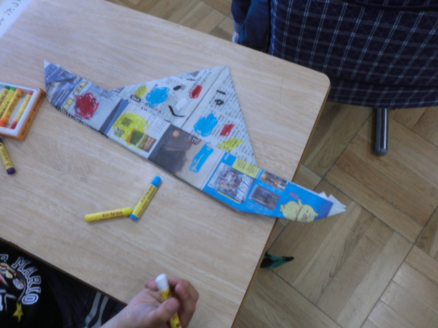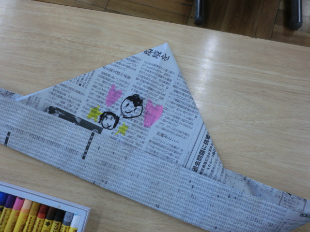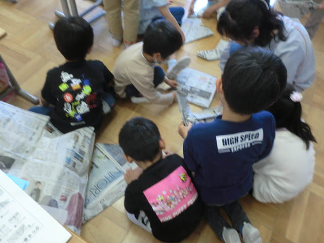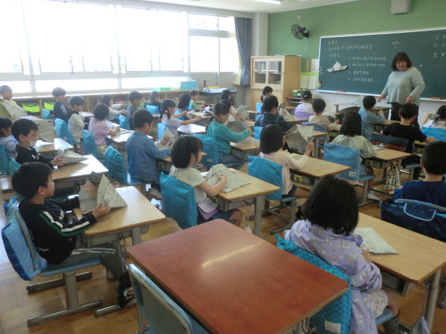 苦戦しながらも、四角い新聞紙が、だんだんとお手本の形に。「やったーできたよ」の喜びの声。工作を楽しむ1年生でした。