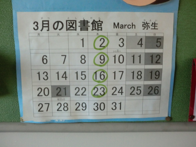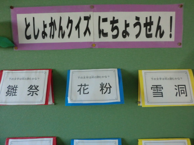 図書クイズコーナーでは、季節を表す漢字「雛祭」「雪洞」「花粉」「弥生」等の読み方が出されていました。