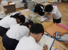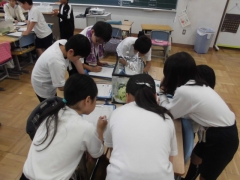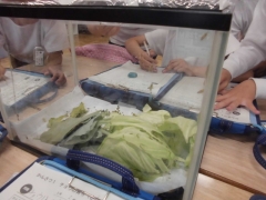 グループの中心に飼育ケースを置いて、さなぎの様子を虫メガネで観察し、大きさや形、色などを記録しました。