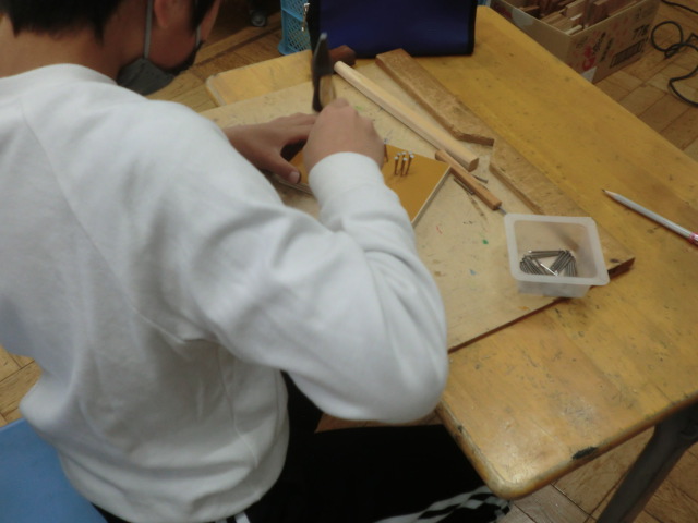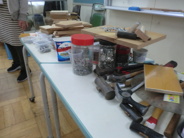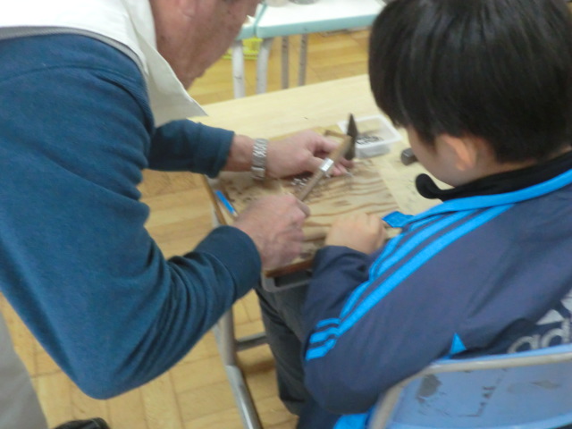学習ボランティアの方にも支援していただきながら、多くの児童が初めての釘打ち体験を慎重に、楽しそうに進めていました。DIYができるようになるといいですね。がんばれ3年生。