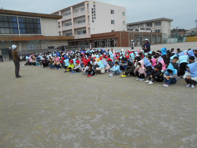 運動場で遊んでいた児童の様子を見ていると、放送がなるや否や、その場に座り、頭を守る行動がとれていました。全員の点呼が終了したところで、「行方不明者がいます!」という担当の先生の叫び声が!今回は、行方不明者がいる想定でした。教職員で捜索隊を組み、校舎の中へ探しに行き、無事見つかりました。