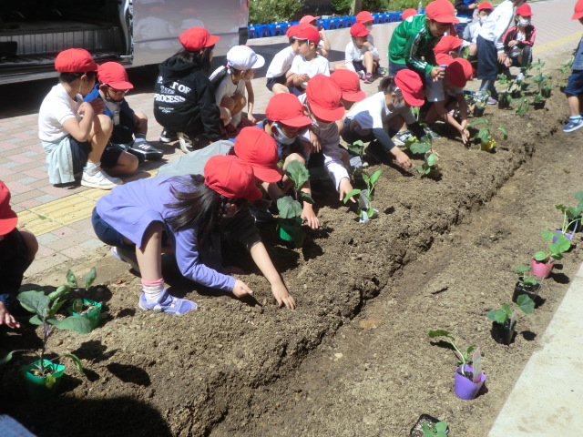 三重興農社の方をゲストティーチャーに迎え、2年生が野菜の苗植えを行いました。