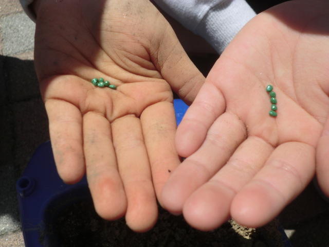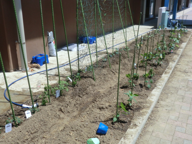 「かぼちゃ」「とうもろこし」「なす」…これらを児童昇降口横の学級園に畝を作り、丁寧に植えました。