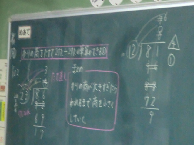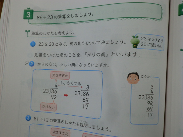割り算の筆算方法は前時までに学んできた4年生。今回は、見当をつけた商(かりの商)が大きかったり小さかったりすることが予想される、微妙な割り算問題を考えていました。割り算は、あまりもなく割り切れると気持ちが良いのですが、そうでない問題のほうが世の中多いものです。