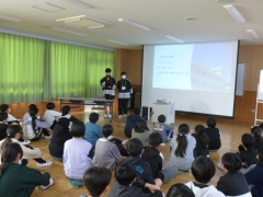 スライドを使い、山手中学校の学校生活のこと(授業や教科、テストのことや部活動のこと等)を教えてくれました。