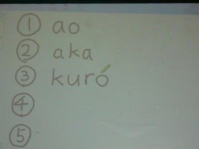 この学級では、教師がクイズ形式にして、黒板に提示した言葉をノートにひらがなで書いていく…と言う活動に楽しんで取り組んでいました。教師が「次は何かな??」と言いながら、書いていくと、「口に出したらあかんよ」と互いに言いながらも、「あ!分かった」などとつぶやきながら進めました。