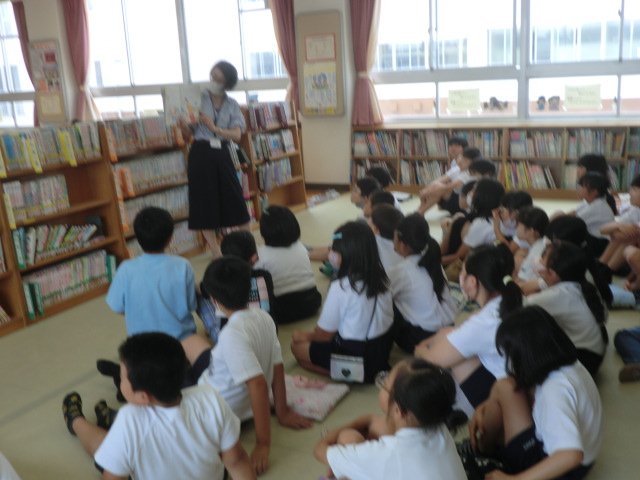 今日は、4年生への読み聞かせ。図書室に、大勢集まりました。