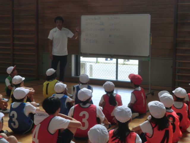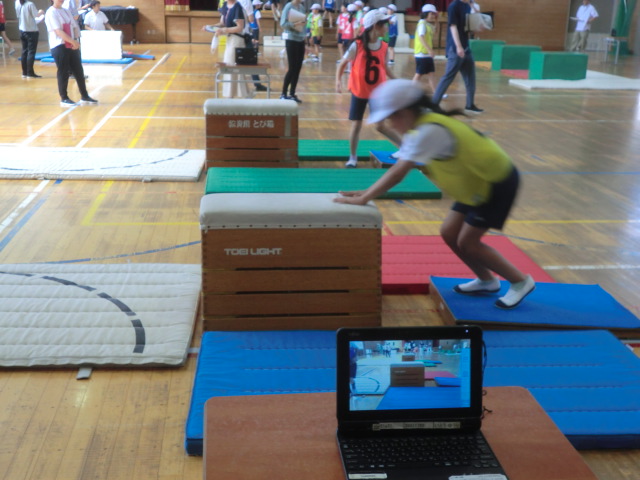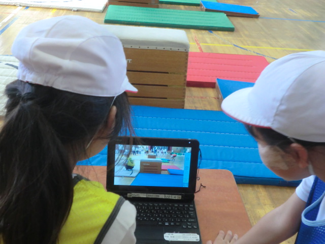 タブレットでフォームをチェック。いろんな言葉が飛び交い、しっかり楽しく運動する4年生でした。