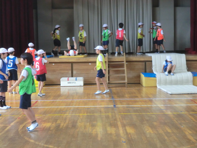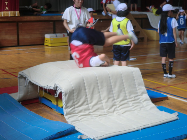体育館に入ると、一面にマットととび箱が。入ってきた4年生はワクワク。