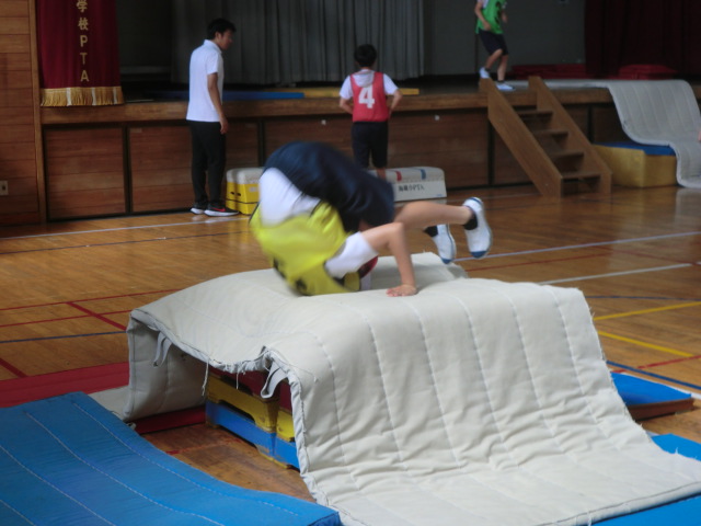 今日の課題は、とび箱やマットを使い、台の上でくるっと一回転。台上前転。