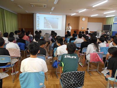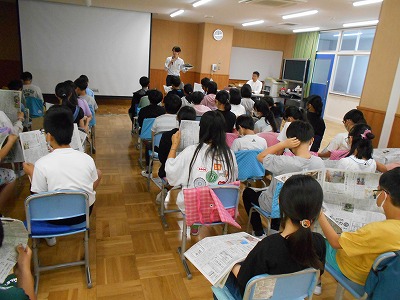 大雨の中、無事帰ってきた6年生。この後は、調べたこと・見てきたことを中心に、自分で新聞にまとめます。その書き方のヒントになるべく、本日は地域の山﨑新聞店さんと中日新聞の記者の方をお招きして、新聞教室&ブイ点検教室を開きました。