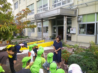 神前こども園の5歳さんが、神前小学校へ遊びに来てくれました。今日は、「秋見つけ」ということで、運動場や草むらの探検をしたそうです。