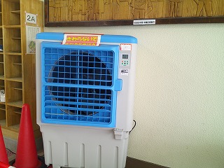 四日市市は、5年前にすべての学校に冷風扇をいただきました。この冷風扇は、水を入れると冷たい風が出てきます。心地よい風が吹きます。