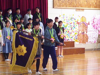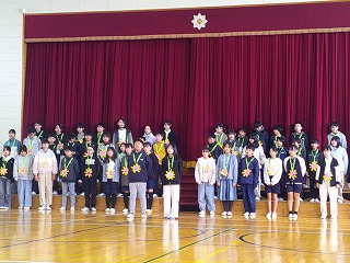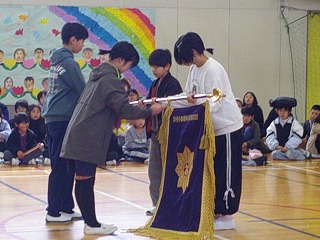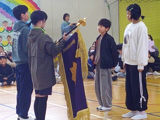 そして、最後に6年生から在校生に「校旗」の受け渡しました。6年生から在校生にしっかりとバトンが渡され、会のお開きとしました。とても素敵な、心あたたまる、思い出に残る6年生を送る会となりました。