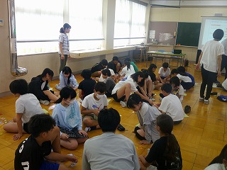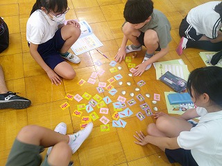 6年生が「お金ってなあに?」という学習をしました。まずは、「物々交換でカレーの材料を集めよう」というゲームに挑戦しました。はじめは、スムーズにカレーの材料が集まるのかなあ…と思っていましたが、うまくは集まりませんでした。そこで、「交換券」というアイテムが現れました。これが現れたことによって、スムーズに材料を集めることができました。このアイテムこそ、「お金」のことでした。「お金」があるといかに便利なのかを体験しました。