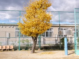 運動場にあるいちょうの木。葉を黄色に染め少しずつ落ち葉となっています。その葉を拾う1年生の姿もありました。