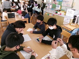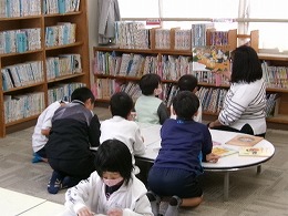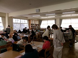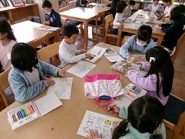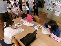 30分休みになると少しずつ人が増えていき、最後は図書室が一杯になるほどの盛況ぶりでした。最初、子どもたちはぬり絵に集中していました。ぬり絵をしながら「わたしは申年」「わたしは酉」のような会話も聞こえてきました。途中で読み聞かせも始まり、子どもたちはゆったりとした時間を過ごしていました。