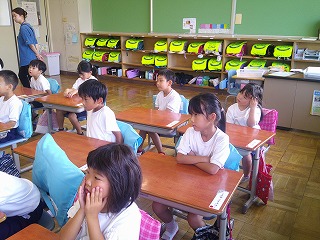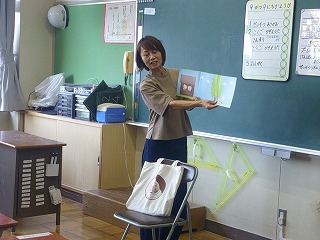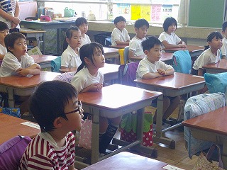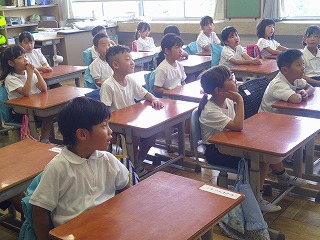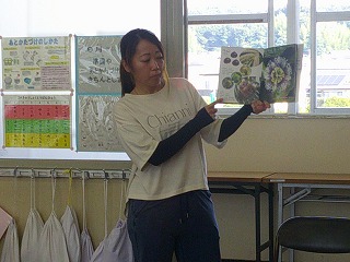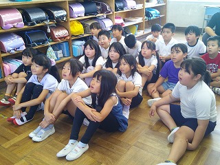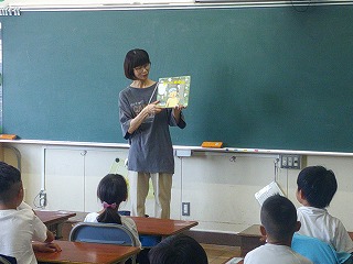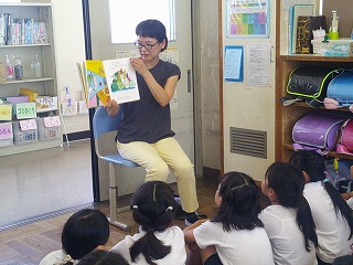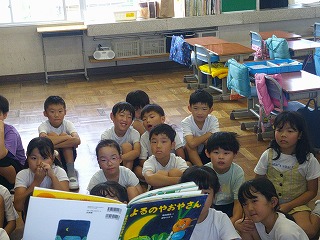 初日は1.2年生でした。子どもたちは、いつも、この日を楽しみにしています。子どもたちの目がキラキラして、絵本を見つめていました。
