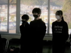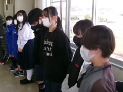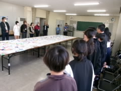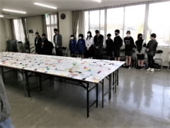 最初は向き合って、自己紹介と折り鶴や色紙、年賀状に込めた気持ちを、一人一人が話していきました。神前小からは、5人の子が代表で参加し、自分の思いを話しました。