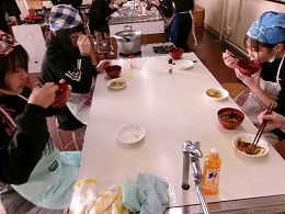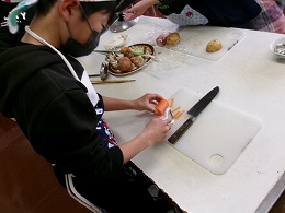 包丁を使って手際よくジャガイモの皮をむく子。その作業ぶりを「すごい」という顔でじっと見ている子。ニンジンを同じ大きさにしようと一生懸命に切る子。煮干しの頭をていねいにとる子。等いろんな姿がありました。