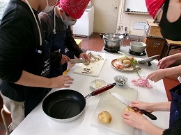 この材料を使って調理が始まりました。今回作るのは「ベーコンとじゃがいものにんにく炒め」「きのこと根菜の汁物」でした。
