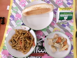 今日の給食のメニューは、みそ焼きうどん、ベジタブルチップス、小型玄米パン、牛乳でした。今日はご当地メニューとして、亀山のみそ焼きうどんが出ました。