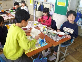 2年A組は、いつもきれいに食べています。この日も見に行くと、子どもたちが気持ちいいくらいたくさん食べていました。友だちに器を見せて「食べましたよ。」と知らせている子もいました。