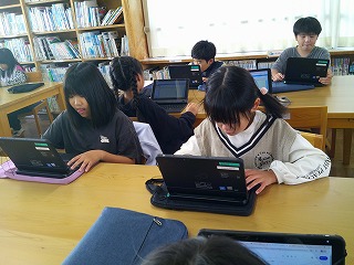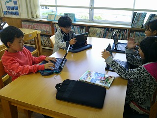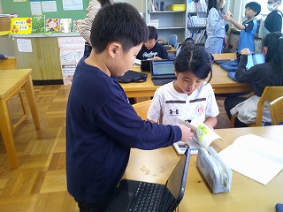 「わたしはしし舞を調べるよ。」「ぼくは「いのこ」を知らせべます。」「大四日市市まつりにするよ。」などと言い、タブレットや図書室の本で調べていました。