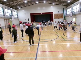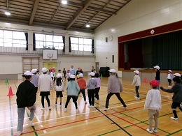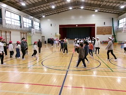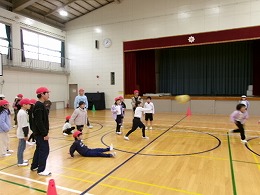 今日の5限目、2・5年生が一緒に体育館でドッジボールを楽しみました。当初は運動場で活動の予定でしたが、雪が降ってきたため場所を変更しました。この活動のねらいは、ともに活動することにより、異学年同士の交流を深めることです。さらに、高学年は