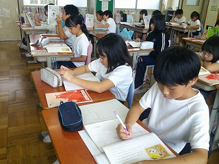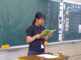 4年A組では、この日、国語の「一つの花」の学習をしていました。実習生の先生も少し緊張気味でしたが、丁寧に授業を進めていました。子どもたちも、一生懸命に聞こうとする態度が見られました。