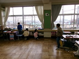 子どもたちは一生懸命に掃除に取り組んでいました。「いつもよりていねいに、いつもできないことをやる」まさにこのような感じでした。掃除中に訪れたお客さんからも「みんな一生懸命に掃除していますね」とほめていただきました。