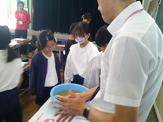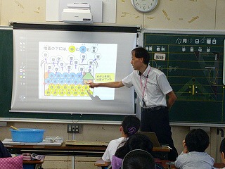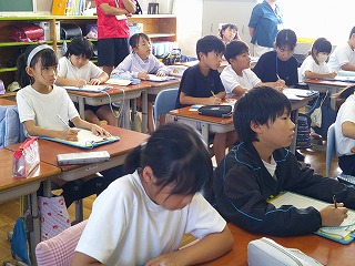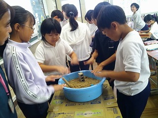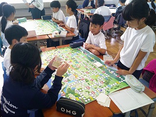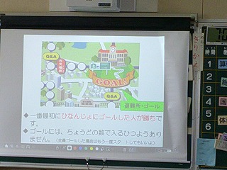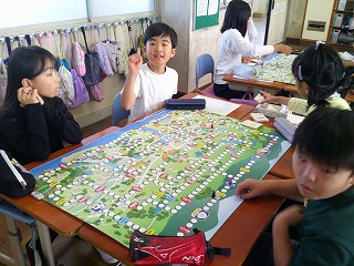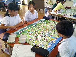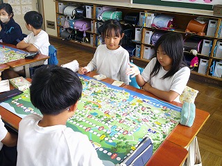 4年生が総合的な学習の時間に「防災」の学習をしています。県の学校防災アドバイザーの方に来ていただき、「防災すごろく」「液状化」について学びました。防災すごろくでは、防災に関するクイズに答えながら「避難所」まで進みました。