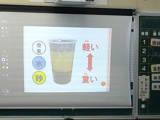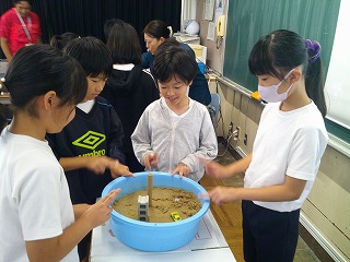 「液状化」については、砂の上に立っている建物や車などの模型が、振動を与えることによって水が地面に上がり建物などが倒れてしまうことを実験で学びました。