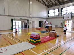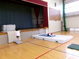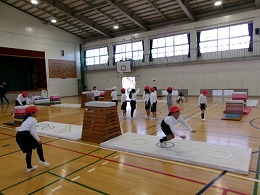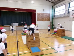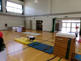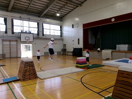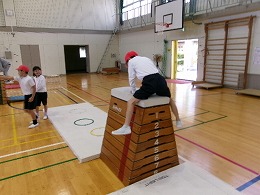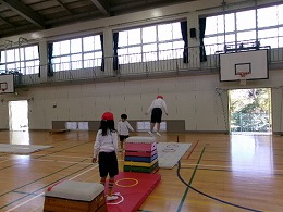 2年生の体育では「跳び箱やマットを使った運動遊び」として、ぴょんぴょんランドを始めました。子どもたちが体育館にある用具(跳び箱、マット、リング等)を使って場づくりを行い、その作った場で楽しく遊んでいました。また、活動の途中に跳び箱の向きを変えたりリングの位置を変えたりと、