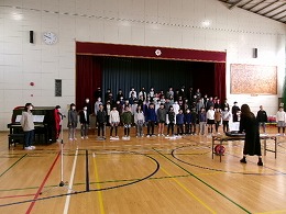神前小学校の合唱曲は「夢のかなう場所へ」でした。身体でリズムをとり素敵な歌声が聞こえてきました。みんなが心を一つにしこれまでの練習の成果が素敵な歌声となって会場中に響き渡っていました。